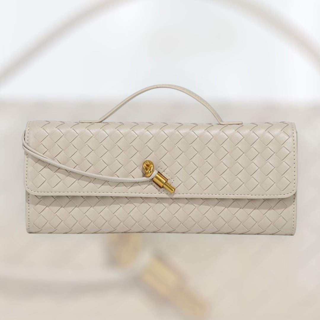 Realizzata in pelle di vitello liscia interamente intrecciata a mano, è una clutch dalla particolare forma rettangolare, di grande tendenza da non perdere! Una borsa estremamente versatile: è, infatti, caraterizzata dalla presenza del manico che permette di indossarla a mano, perfetta in questo caso da utilizzare in situazioni serali con look più eleganti e ricercati; ma puoi renderla al tempo stesso più sportiva, essendo dotata della sua tracolla regolabile e rimovibile che consente di indossarla anche a tracolla o crossbody, ideale da utilizzare con outfit più casual e giornalieri. Presenta hardware dalla finitura gold, chiusura ad incastro caratterizzata dalla presenza di un accessorio a forma di nodo dorato. Unico scomparto tono su tono, ulteriore taschino interno privo di zip e dicitura che certifica la vera pelle. È dotata di tracolla regolabile e rimovibile. Può essere indossata: a mano, a tracolla o crossbody (traversale).
