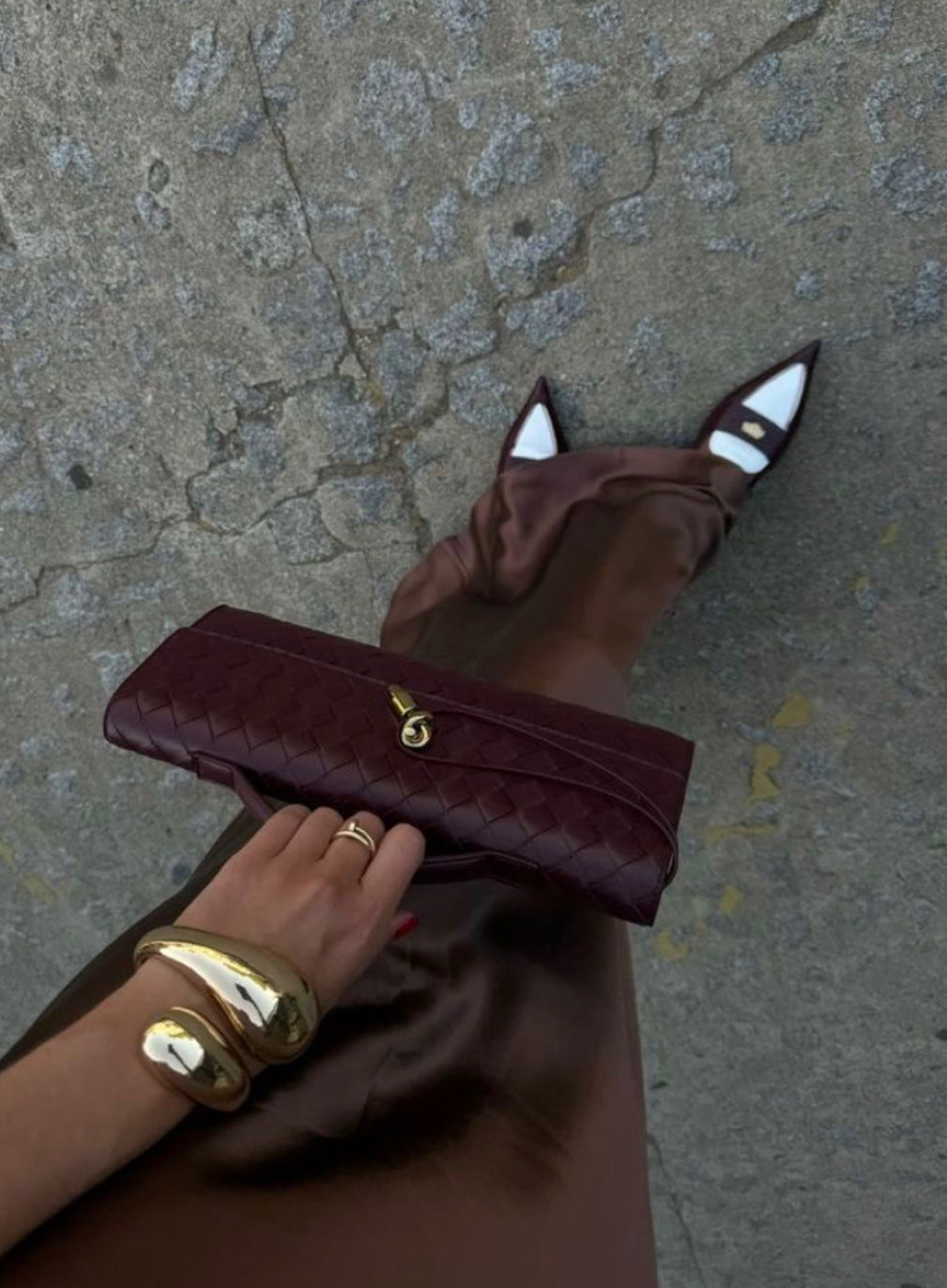 Realizzata in pelle di vitello liscia interamente intrecciata a mano, è una clutch dalla particolare forma rettangolare, di grande tendenza da non perdere! Una borsa estremamente versatile: è, infatti, caraterizzata dalla presenza del manico che permette di indossarla a mano, perfetta in questo caso da utilizzare in situazioni serali con look più eleganti e ricercati; ma puoi renderla al tempo stesso più sportiva, essendo dotata della sua tracolla regolabile e rimovibile che consente di indossarla anche a tracolla o crossbody, ideale da utilizzare con outfit più casual e giornalieri. Presenta hardware dalla finitura gold, chiusura ad incastro caratterizzata dalla presenza di un accessorio a forma di nodo dorato. Unico scomparto tono su tono, ulteriore taschino interno privo di zip e dicitura che certifica la vera pelle. È dotata di tracolla regolabile e rimovibile. Può essere indossata: a mano, a tracolla o crossbody (traversale).
